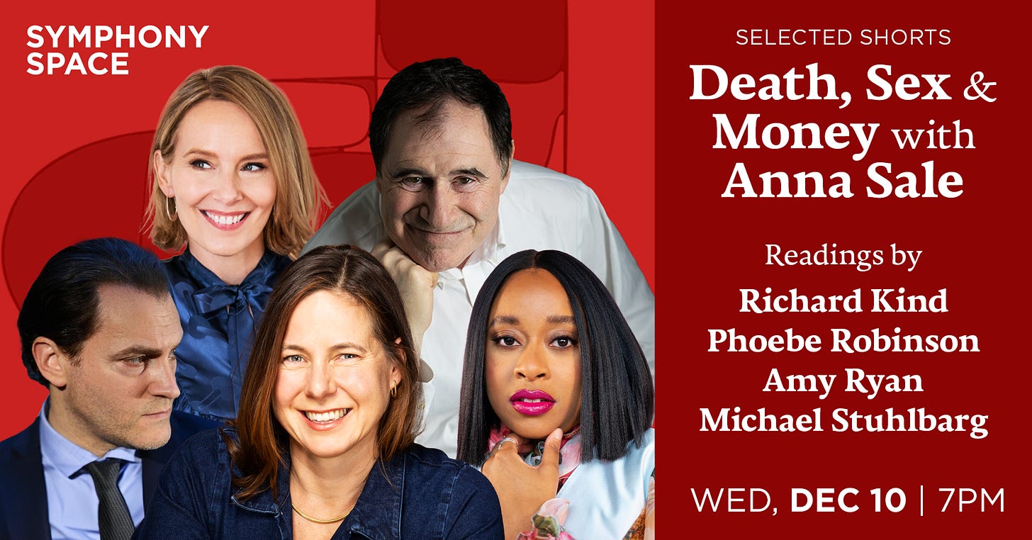 I’m hosting Selected Shorts at Symphony Space, and look at this lineup of readers — Richard Kind! Amy Ryan! Phoebe Robinson! Michael Stuhlbarg! All reading short fiction about death-y, sexy, money-y themes. I’m stoked. Tickets are here.